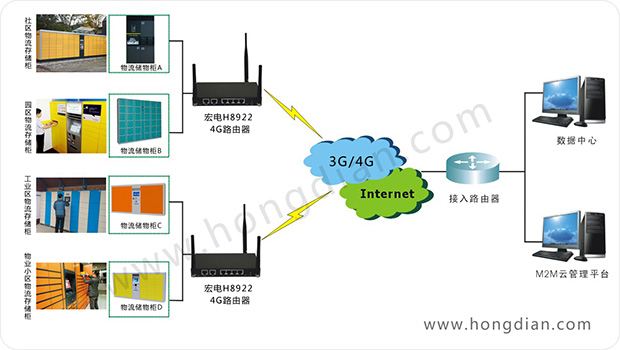 本次項目中宏電給客戶提供的是一套覆蓋通信硬件、軟件、平臺的3G無線聯(lián)網通信解決方案,系統(tǒng)主要由客戶部署的物流快遞柜(包含讀寫控制器、電子鎖、存物柜等部分)、宏電H8922 3G/4G雙模路由器、宏電M2M云管理平臺三部分組成。不需變動客戶項目部署規(guī)劃,也不需額外做各種對接研發(fā)工作,通過宏電H8922 3G/4G雙模路由器能夠為自助快遞柜系統(tǒng)架設高速、穩(wěn)定的聯(lián)網與數據傳輸通道,將所有取、投件等信息傳輸到企業(yè)后臺,供自助快遞箱運營企業(yè)進行業(yè)務分析和操作,從而實現(xiàn)了任何人在任何時間都可通過自助快遞柜進行包裹的收、發(fā)。同時,運營企業(yè)通過宏電M2M云管理平臺能夠實現(xiàn)對分散在不同地點的快遞柜終端進行統(tǒng)一的運行狀態(tài)監(jiān)管,有效降低企業(yè)的運維成本。