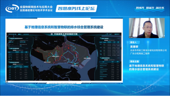 北京市市政工程設計研究總院有限公司廣東分院高級工程師吳著群先生發(fā)表了《基于地理信息系統(tǒng)和智慧物聯(lián)的排水綜合管理系統(tǒng)建設》主題演講,以汕頭市建設的排水在線監(jiān)測系統(tǒng)為例,深入淺出地講解了如何運用信息化手段解決城市排水系統(tǒng)管理中面臨的問題。