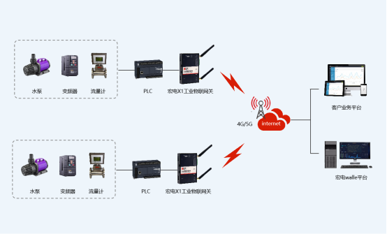 將X1工業(yè)智能網(wǎng)關(guān)與泵房現(xiàn)場(chǎng)PLC控制器連接,多方位采集泵房設(shè)備的運(yùn)行狀態(tài),通過(guò)4G/5G無(wú)線方式上報(bào)到客戶的業(yè)務(wù)平臺(tái),泵房管理人員可以在業(yè)務(wù)平臺(tái)或者內(nèi)部局域網(wǎng)隨時(shí)遠(yuǎn)程監(jiān)測(cè)站內(nèi)狀態(tài),上級(jí)領(lǐng)導(dǎo)及相關(guān)人員也可通過(guò)Internet公網(wǎng)或內(nèi)部局域網(wǎng)瀏覽到泵房相關(guān)信息。