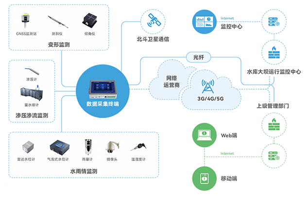 系統(tǒng)包含水庫(kù)雨水情監(jiān)測(cè)系統(tǒng)和大壩安全監(jiān)測(cè)自動(dòng)化系統(tǒng)。水庫(kù)雨水情監(jiān)測(cè)系統(tǒng)以遙測(cè)終端為核心,配置翻斗式雨量計(jì)、雷達(dá)式或氣泡式水位計(jì)、電源系統(tǒng)、避雷系統(tǒng)以及相關(guān)的土建及附屬設(shè)施,實(shí)現(xiàn)雨水情信息的自動(dòng)采集和自動(dòng)傳輸。大壩安全監(jiān)測(cè)自動(dòng)化系統(tǒng)可實(shí)現(xiàn)大壩表面變形監(jiān)測(cè)和滲流監(jiān)測(cè)。整個(gè)系統(tǒng)實(shí)現(xiàn)水庫(kù)大壩的全面感知監(jiān)測(cè)、綜合風(fēng)險(xiǎn)評(píng)估、科學(xué)輔助決策、智能分析預(yù)警、常態(tài)巡檢及預(yù)案管理等主要功能,助力水庫(kù)智慧化監(jiān)管。