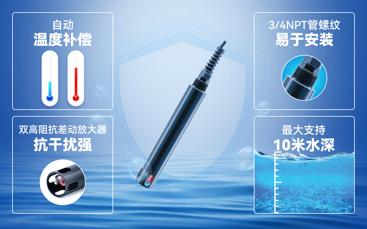 采用基于PVC膜的銨離子選擇電極制作而成,內(nèi)置三個(gè)電極可以測(cè)量水中的NH3_N濃度、PH值和溫度,主要用于測(cè)試水中的銨離子含量。