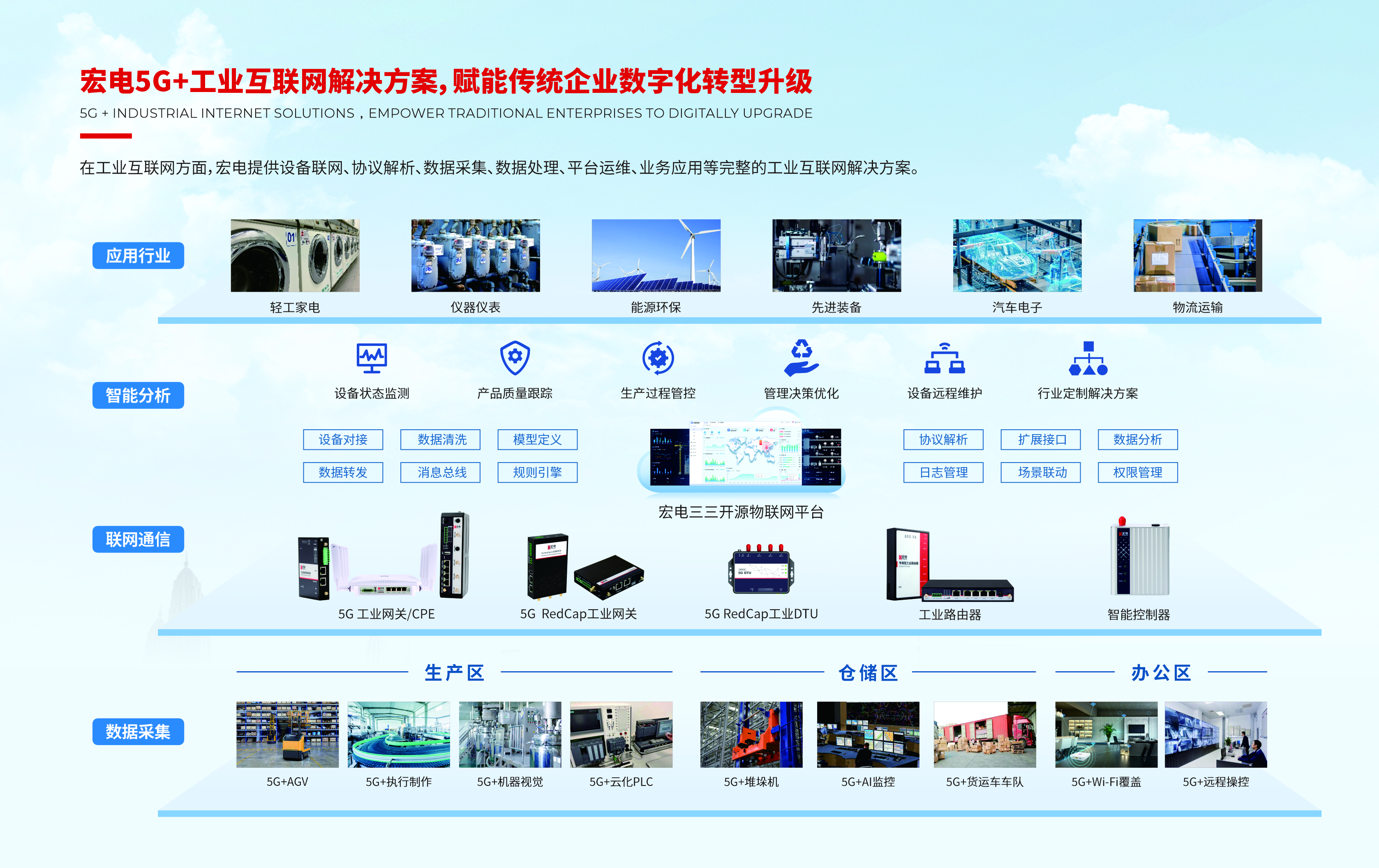 宏電股份作為全球化的物聯(lián)?產(chǎn)品與服務(wù)提供商,始終致力于引領(lǐng)物聯(lián)網(wǎng)產(chǎn)業(yè)發(fā)展方向,推動(dòng)數(shù)字化轉(zhuǎn)型和智能升級(jí)。在工業(yè)互聯(lián)網(wǎng)方面,宏電股份重點(diǎn)解決OT和IT融合的問題,通過宏電三三開源物聯(lián)網(wǎng)平臺(tái)可提供多元異構(gòu)設(shè)備的快速接入與管理、數(shù)據(jù)存儲(chǔ)與轉(zhuǎn)發(fā)、告警與規(guī)則引擎、多租戶管理等核心底座能力,實(shí)現(xiàn)設(shè)備聯(lián)網(wǎng)、協(xié)議解析、數(shù)據(jù)采集、數(shù)據(jù)處理、平臺(tái)運(yùn)維、能耗管理等一套完整的工業(yè)互聯(lián)網(wǎng)解決方案,并成功入選廣東省工業(yè)互聯(lián)網(wǎng)產(chǎn)業(yè)生態(tài)供給資源池。在5G全連接工廠方面,宏電股份已經(jīng)在智能制造、鋼鐵、石化、家電、汽車等行業(yè)累計(jì)落地了數(shù)百多個(gè)5G項(xiàng)目,打造了一批明星5G產(chǎn)品,包括5G Redcap工業(yè)智能網(wǎng)關(guān)、5G工業(yè)DTU、5G工業(yè)路由器、5G工業(yè)網(wǎng)關(guān)、5G工業(yè)CPE、5G車載網(wǎng)關(guān)等,滿足工廠內(nèi)生產(chǎn)區(qū)、倉(cāng)儲(chǔ)區(qū)、辦公區(qū)等不同場(chǎng)景的需求。