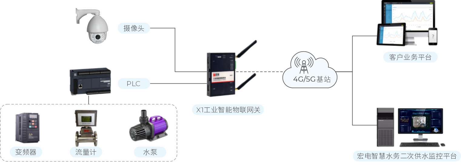 宏電工業(yè)智能物聯(lián)網(wǎng)關(guān)具有強(qiáng)大的數(shù)據(jù)采集和處理能力,將X1工業(yè)智能物聯(lián)網(wǎng)關(guān)與泵站現(xiàn)場PLC控制器、視頻監(jiān)控設(shè)備連接,通過RS485/RS232串口或LAN口多方位采集泵站設(shè)備的啟停狀態(tài)、運(yùn)行數(shù)據(jù),將視頻圖像,水池水位,出站流量、壓力,泵站供應(yīng)電流、電壓,泵的開關(guān)狀態(tài)、工作電流、電壓、頻率等數(shù)據(jù)通過4G/5G方式上報到宏電智慧水務(wù)二次供水監(jiān)控平臺。實(shí)現(xiàn)泵站運(yùn)行狀態(tài)實(shí)時監(jiān)控,有助于及時發(fā)現(xiàn)問題并防止事故發(fā)生。