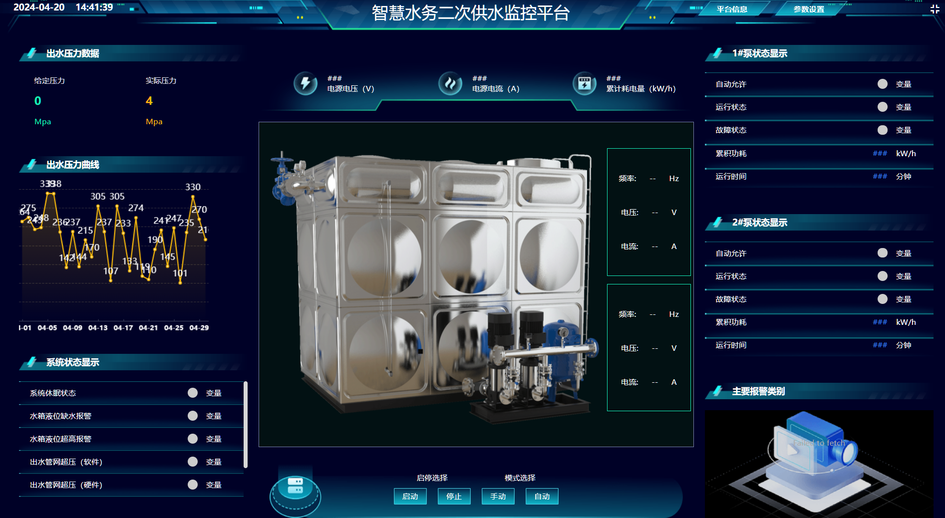 可視化組態(tài)展示:基于泵站CAD平面圖及現(xiàn)場照片,構(gòu)建3D模型,標(biāo)注閥門、儀表、傳感器等圖標(biāo),點(diǎn)擊顯示實(shí)時值及狀態(tài),實(shí)現(xiàn)水泵實(shí)時運(yùn)行數(shù)據(jù)、電表數(shù)據(jù)、供水壓力/流量數(shù)據(jù)可視化展示。
