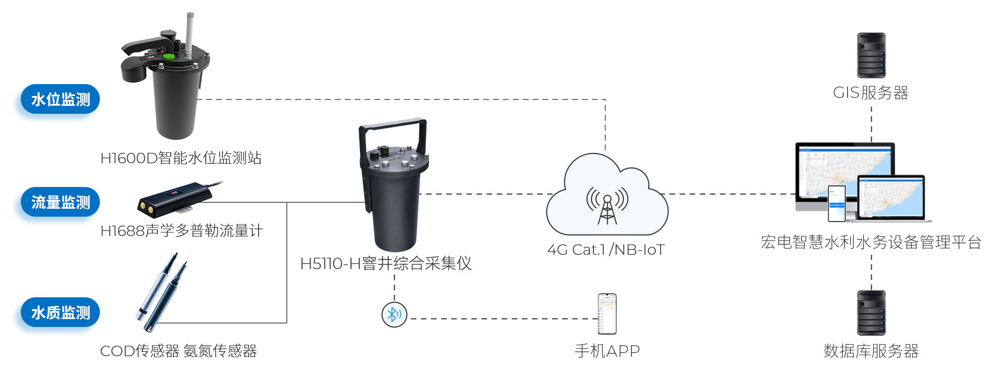 智能水質(zhì)監(jiān)測站由宏電H5110-H窨井綜合采集儀和COD傳感器、氨氮傳感器等多種水質(zhì)傳感器組成。水質(zhì)傳感器測量窨井中的COD、氨氮等多種水質(zhì)參數(shù),H5110-H窨井綜合采集儀將數(shù)據(jù)通過4G Cat.1/NB-IoT網(wǎng)絡(luò)傳輸至監(jiān)測平臺,當(dāng)水質(zhì)數(shù)據(jù)達(dá)到預(yù)警值時,平臺將發(fā)出預(yù)警信息,及時提醒管理人員采取應(yīng)對措施。
