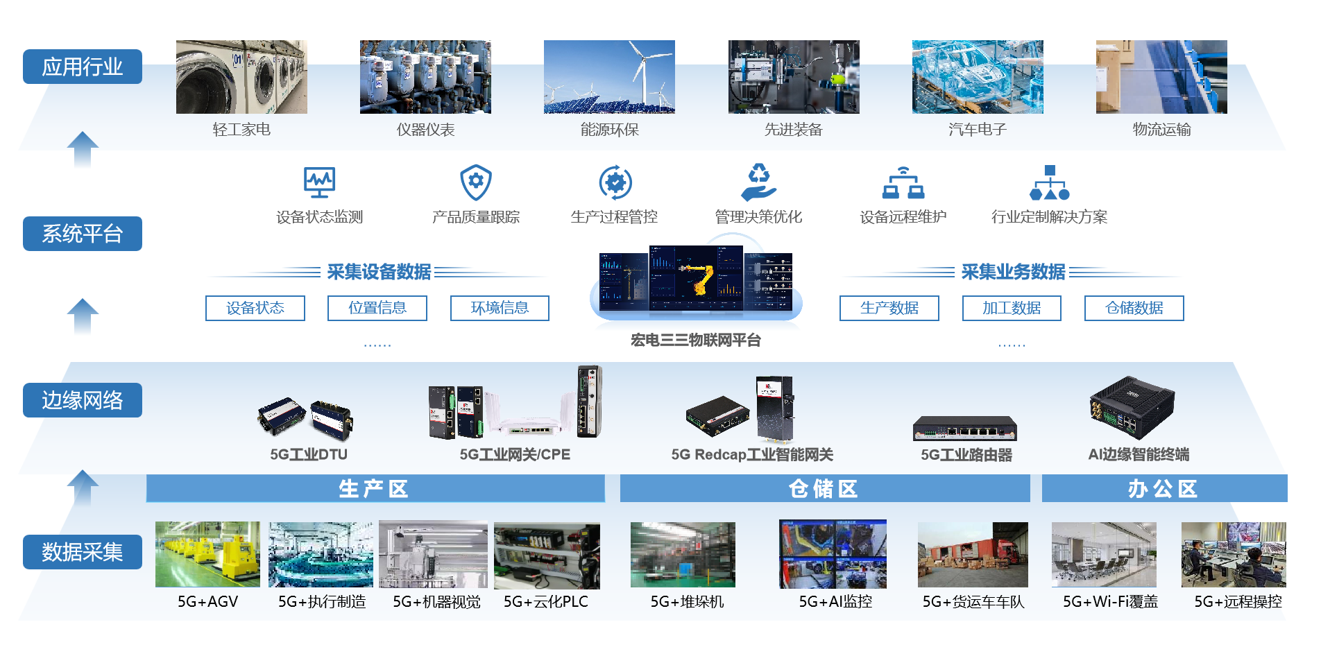 在工業(yè)互聯(lián)網(wǎng)方面,宏電股份重點解決OT和IT融合的問題,提供設(shè)備聯(lián)網(wǎng)、協(xié)議解析、數(shù)據(jù)采集、數(shù)據(jù)處理、平臺運(yùn)維、能耗管理等完整的工業(yè)互聯(lián)網(wǎng)解決方案。例如,在生產(chǎn)區(qū)可實現(xiàn)工業(yè)裝備遠(yuǎn)程運(yùn)維、PLC之間協(xié)同工作、機(jī)器視覺高清圖片視頻高速傳輸?shù)葢?yīng)用;在倉儲區(qū)則可以做到AGV互聯(lián)互通、移動設(shè)備無線聯(lián)網(wǎng),確保終端在移動過程中業(yè)務(wù)不中斷;在園區(qū)中通過WiFi Mesh同頻組網(wǎng),實現(xiàn)工廠5G網(wǎng)絡(luò)全覆蓋,數(shù)據(jù)不出廠。