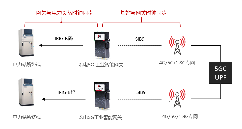 智能配網(wǎng)站所終端DTU裝置通過網(wǎng)口接入宏電5G工業(yè)網(wǎng)關(guān),網(wǎng)關(guān)通過SIB9消息獲取當(dāng)前時鐘信息,再以IRIG-B碼的方式脈沖到電力終端,兩臺網(wǎng)關(guān)輸出時間差僅為10us左右,通過網(wǎng)關(guān)高精度授時的點到點雙向通信網(wǎng)絡(luò)來保證數(shù)據(jù)高速傳輸,幫助差動保護(hù)裝置快速定位隔離故障,完成故障自愈,實現(xiàn)配網(wǎng)差動保護(hù)業(yè)務(wù)。