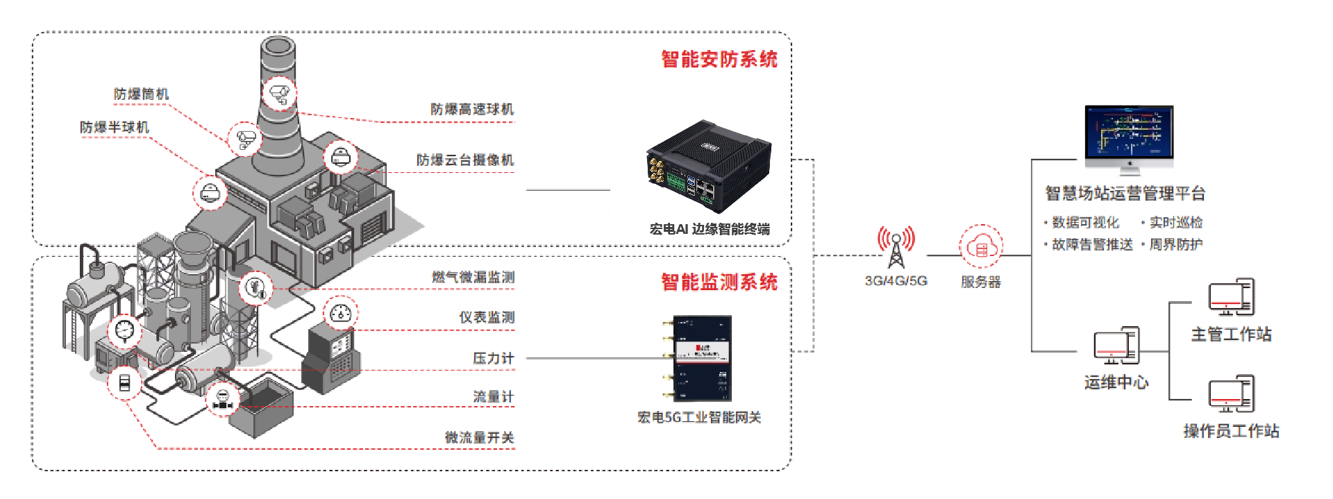 宏電5G工業(yè)網(wǎng)關(guān)具備強(qiáng)大的邊緣計算能力,能夠?qū)崿F(xiàn)多品牌、多型號、多協(xié)議類型燃?xì)饬髁坑嫷臄?shù)據(jù)采集與解析,實現(xiàn)對壓力、流量、可燃?xì)怏w等傳感器數(shù)據(jù)實時監(jiān)測。通過部署AI邊緣智能終端對油氣場站內(nèi)視頻數(shù)據(jù)進(jìn)行人臉、工服安全帽、吸煙打電話、火焰煙霧等Al分析識別,對場站的出入口、周界管理做到巡檢有計劃、過程有監(jiān)督、事后有分析、數(shù)據(jù)可視化。助力企業(yè)實現(xiàn)智慧化運(yùn)營,讓看不見的風(fēng)險實時可見,切實守護(hù)城市安全生命線。