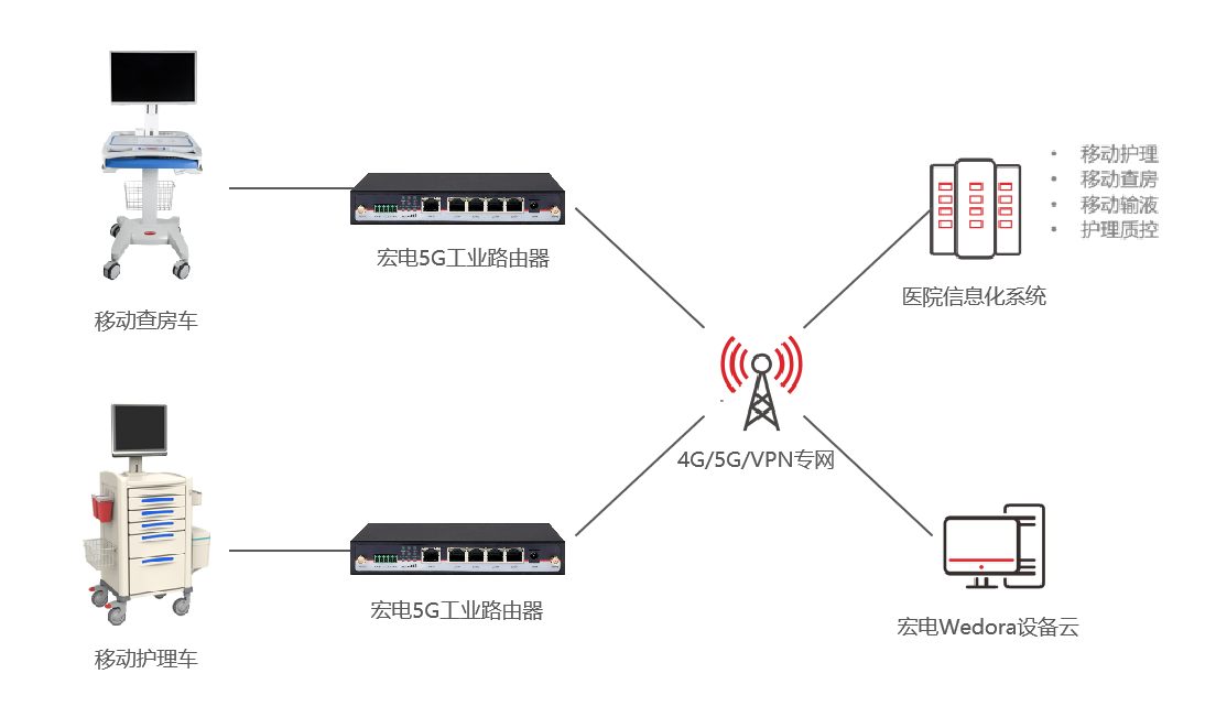 通過在移動護(hù)理車、查房車上部署5G工業(yè)路由器,以5G/4G APN專網(wǎng)為數(shù)據(jù)交互載體,醫(yī)護(hù)人員可實時接入院內(nèi)診療系統(tǒng),與院內(nèi)患者的電子病歷信息系統(tǒng)實時交互,患者檔案或醫(yī)療高清影像可秒速加載,實現(xiàn)醫(yī)院內(nèi)外信息實時共享。