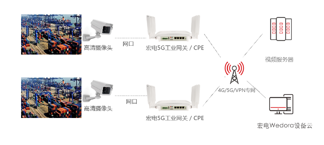 在港口集裝箱碼頭部署宏電5G工業(yè)CPE搭建遠(yuǎn)程監(jiān)控系統(tǒng),通過遠(yuǎn)程高清視頻方式實時查看龍門吊現(xiàn)場工作情況,減少人員定期攀爬龍門吊查詢視頻帶來的安全風(fēng)險,同時利用5G網(wǎng)絡(luò)的高速特性,后端安全管控人員可以實時調(diào)用前端畫面,當(dāng)發(fā)現(xiàn)有異常情況時立即呼叫,將安全隱患遏制在萌芽階段。