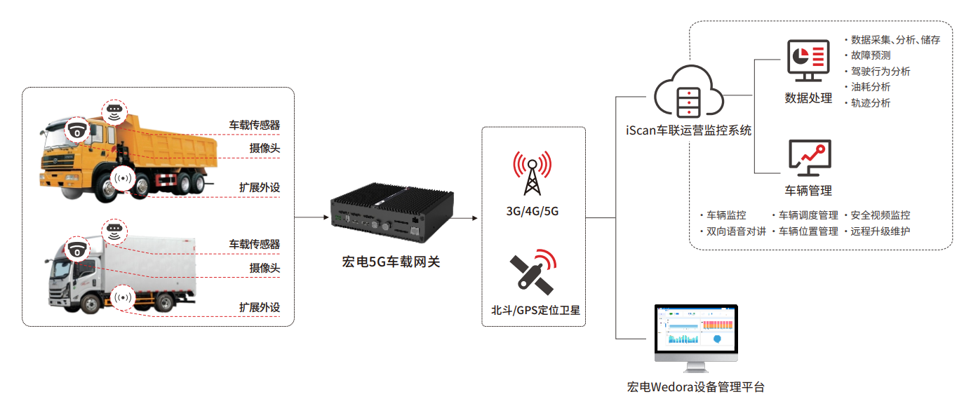 宏電車載網(wǎng)關(guān)為車輛提供高速安全的5G/4G網(wǎng)絡(luò),通過豐富的接口將車載攝像頭、調(diào)度終端、車載機(jī)頂盒等設(shè)備統(tǒng)一接入網(wǎng)絡(luò),實現(xiàn)對貨運(yùn)車輛的規(guī)范管理和統(tǒng)一調(diào)度,提高車輛運(yùn)營效率,對駕駛員的不安全駕駛行為做到實時監(jiān)管,并過語音對講的方式做到實時提醒,減少事故發(fā)生的概率。