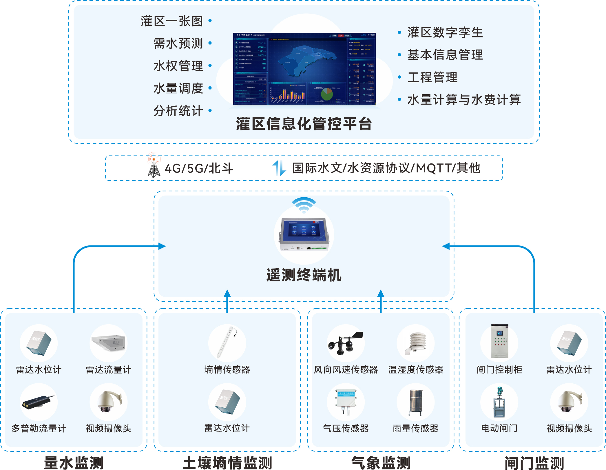 通過實(shí)時(shí)數(shù)據(jù)監(jiān)測(cè)、精準(zhǔn)控制、自動(dòng)化管理、智慧化決策支持等方式,實(shí)現(xiàn)灌區(qū)的綜合一體化監(jiān)控,為灌區(qū)的日常運(yùn)管、水資源合理配置、灌溉調(diào)度等提供精準(zhǔn)的數(shù)據(jù)支持與科學(xué)的決策依據(jù),從而提高全灌區(qū)的用水效率。
