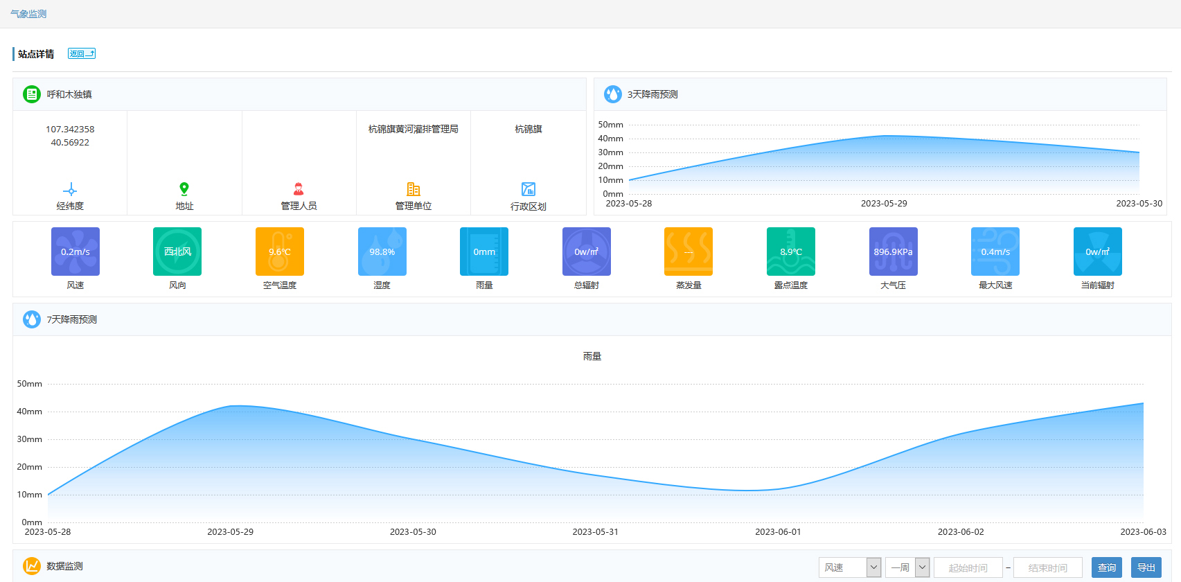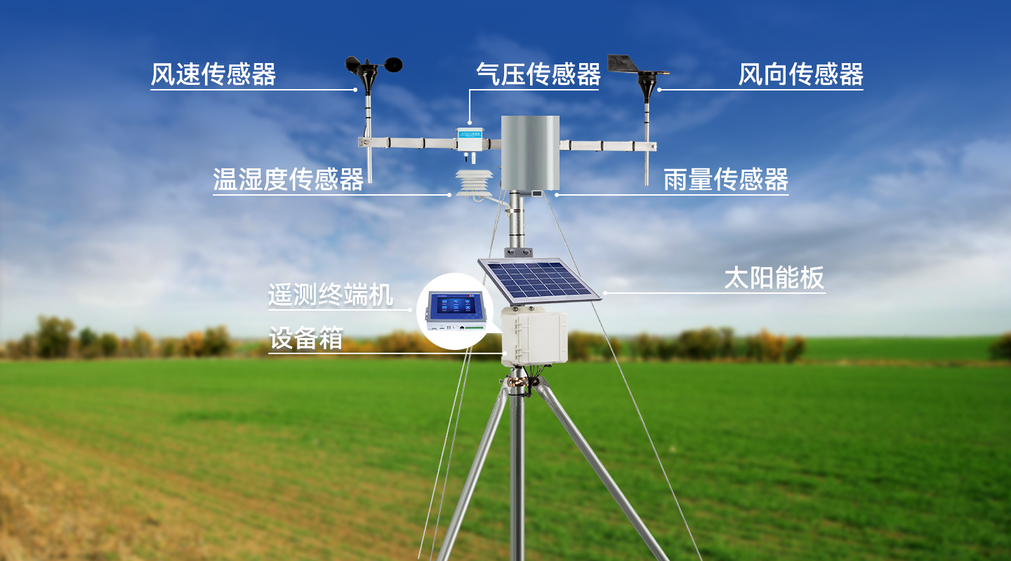 氣象監(jiān)測(cè)主要包括對(duì)灌區(qū)的降雨量、溫度、相對(duì)濕度、大氣壓強(qiáng)、風(fēng)向風(fēng)速和太陽(yáng)輻射等氣象要素信息監(jiān)測(cè),通過部署氣壓計(jì)、溫度計(jì)、濕度計(jì)、風(fēng)向風(fēng)速計(jì)、降雨量計(jì)等傳感設(shè)備,實(shí)現(xiàn)對(duì)灌區(qū)農(nóng)田小氣候的無(wú)人值守全天候監(jiān)測(cè)。