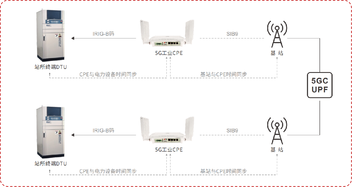基于宏電5G工業(yè)智能網(wǎng)關/CPE的線路差動保護解決方案通過在兩端的站所終端DTU上部署5G工業(yè)智能網(wǎng)關/CPE,構建5G高速網(wǎng)絡實現(xiàn)終端間的互聯(lián)互通;5G基站通過GPS/北斗衛(wèi)星獲取精準定時,與標準時間進行同步后,宏電5G工業(yè)智能網(wǎng)關/CPE通過空口SIB9消息獲取當前精準時鐘信息,再通過IRIG-B碼的方式脈沖到站所終端DTU,站所終端DTU在接收到數(shù)據(jù)后解析B碼信息,獲取標準時間,從而實現(xiàn)各裝置之間以及現(xiàn)場裝置與主站間的時鐘同步,實現(xiàn)點對點快速傳輸,完成故障自愈。