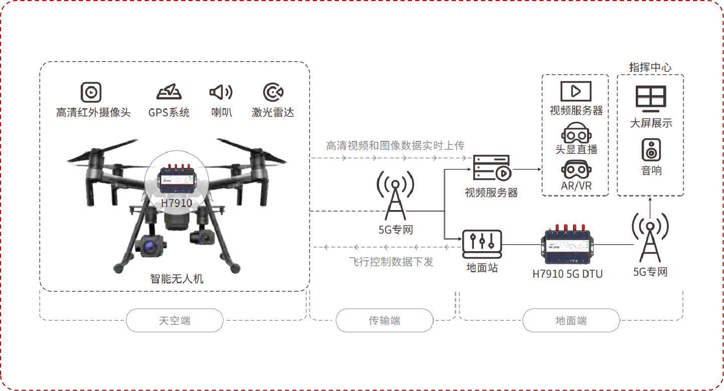 宏電輸電線路無人機(jī)巡檢解決方案將宏電5G DTU內(nèi)置于巡檢無人機(jī)內(nèi),通過網(wǎng)口連接無人機(jī)攝像頭,實(shí)時(shí)將無人機(jī)拍攝的輸電線路圖像、視頻等數(shù)據(jù)上傳到視頻服務(wù)器和數(shù)據(jù)服務(wù)器,地面端通過宏電5G DTU與天空端進(jìn)行數(shù)據(jù)交互,把數(shù)據(jù)服務(wù)器上的無人機(jī)拍攝的畫面調(diào)取到大屏上,便于地面指揮中心及時(shí)了解線路狀況,進(jìn)行故障預(yù)警和應(yīng)急處理。