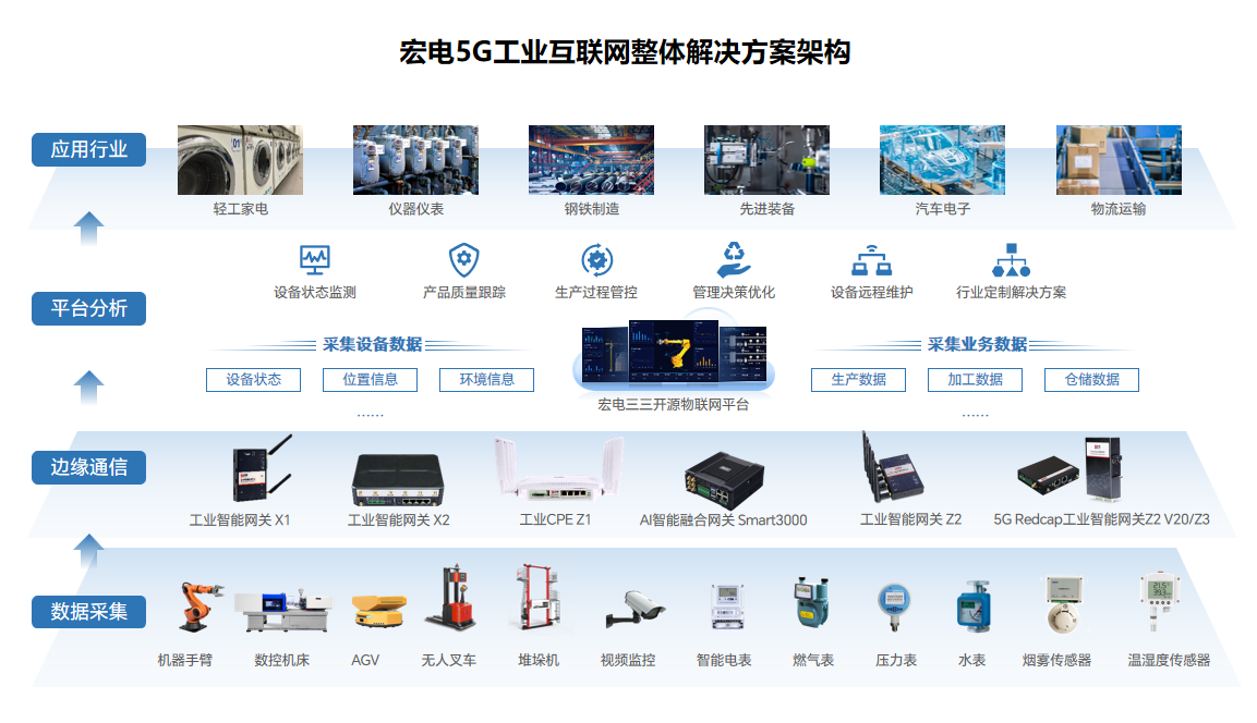 宏電5G工業(yè)互聯(lián)網(wǎng)解決方案是一整套端+邊+云工業(yè)互聯(lián)網(wǎng)整體解決方案。該方案采用宏電自主研發(fā)的邊緣通信智能終端及三三開源物聯(lián)網(wǎng)平臺(tái),提供設(shè)備聯(lián)網(wǎng)、協(xié)議解析、邊緣計(jì)算、平臺(tái)運(yùn)維等功能,為離散無序的生產(chǎn)數(shù)據(jù)建立“秩序”,實(shí)現(xiàn)海量驅(qū)動(dòng)接入、數(shù)據(jù)采集、統(tǒng)計(jì)分析、轉(zhuǎn)發(fā)服務(wù)。宏電5G工業(yè)互聯(lián)網(wǎng)解決方案核心技術(shù)涵蓋網(wǎng)絡(luò)切片、5G RedCap、5G DNN、5G LAN、邊緣計(jì)算、協(xié)議解析、大數(shù)據(jù)等多技術(shù)融合創(chuàng)新,并在交通、水務(wù)、熱力、鋼鐵、家電、汽車等多個(gè)行業(yè)進(jìn)行了應(yīng)用,幫助客戶實(shí)現(xiàn)對(duì)產(chǎn)品生產(chǎn)進(jìn)程、生產(chǎn)效率、質(zhì)量檢測(cè)、設(shè)備運(yùn)行等管理過程的數(shù)字化與智能化改造,幫助企業(yè)實(shí)現(xiàn)精細(xì)化管理、降低管理成本并提高市場(chǎng)競(jìng)爭力。