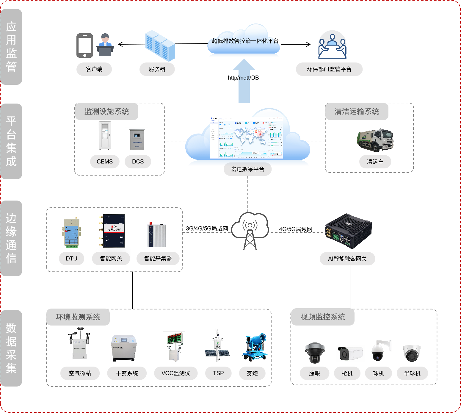 通過宏電智能網(wǎng)關(guān)、DTU、智能控制器等智能通信終端及三三物聯(lián)網(wǎng)云平臺(tái)構(gòu)建集中化數(shù)據(jù)采集系統(tǒng),建立數(shù)據(jù)治理規(guī)則和流程,有效保證廠區(qū)數(shù)據(jù)的一致性、完整性、準(zhǔn)確性和安全性。打通CEMS和DCS數(shù)據(jù),實(shí)現(xiàn)有組織排放全流程監(jiān)測(cè)、無(wú)組織排放三維立體網(wǎng)絡(luò)化智能監(jiān)控和智能聯(lián)動(dòng)治理系統(tǒng)、清潔運(yùn)輸系統(tǒng)的數(shù)據(jù)聯(lián)動(dòng),并提供MQTT/HTTP/DB等開放接口,實(shí)現(xiàn)管控治一體化應(yīng)用系統(tǒng)的數(shù)據(jù)共享和協(xié)同。