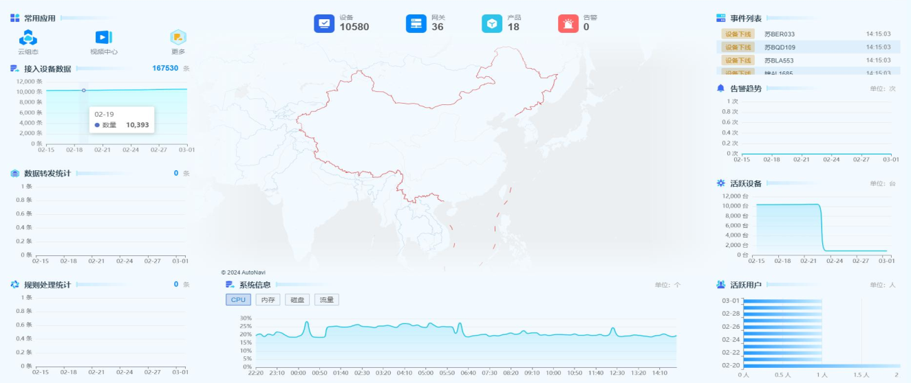 一張圖全局展示,包括全廠接入設(shè)備總數(shù)、數(shù)據(jù)轉(zhuǎn)發(fā)統(tǒng)計(jì)、告警事件及告警趨勢(shì),支持增刪改查所有監(jiān)測(cè)、監(jiān)控、治理等前端硬件設(shè)備臺(tái)賬信息。